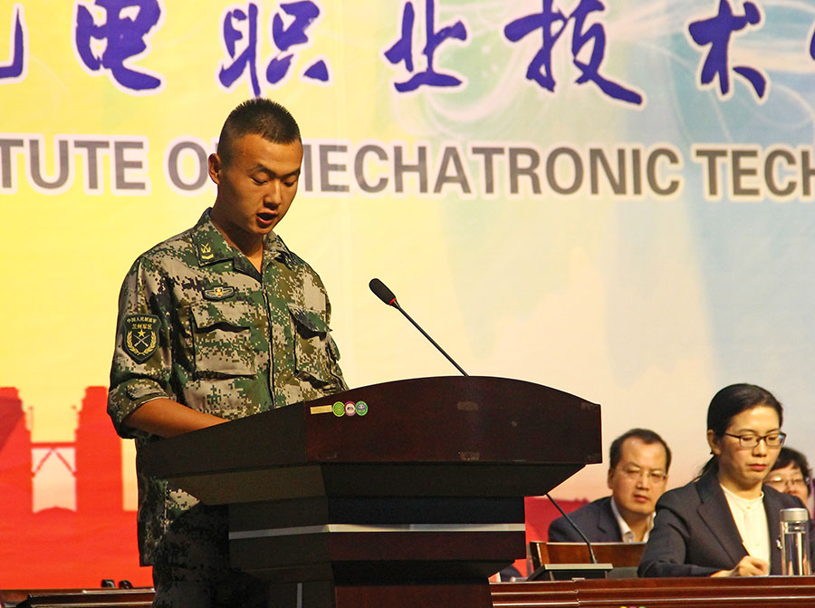 国家级名师,信息工程系专业带头人郭靖老师代表全体教职工,16通信技术专业何晶同学代表在校生,17级机电技术马润华代表新生,秦岭学生军训基地副主任卢春国、军训教官陈航等先后发言,表达了对新生的欢迎和关怀,也对军训和今后的学习生活提出了殷切的期望。