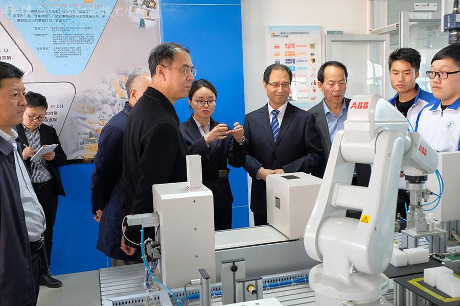 在学院新建的现代化汽车机电大楼,刘斌一行到机器人应用协同创新中心、电气技术、智能控制应用技术中心、工业机器人技术应用、电器安装与维护、高低压供配电、吉利汽车“订单班”等实训教室,详细了解学院特色专业建设、校企业合作等方面情况,对学院取得的发展成绩予以肯定。