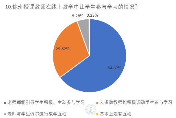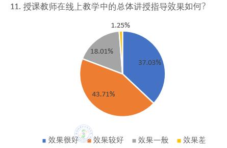通过问卷调查数据分析:85%以上的同学认为授课教师线上教学工作认真,97.13%的学生感觉授课教师线上教学的课程准备较充分;94.49%的学生认为大多教师都能积极调动学生参与学习;85.81%的同学认为线上教学教师的总体讲授指导效果较好;87.48%的学生认为教师作业、课后辅导等方面的工作比较认真。教师“教”和学生“学”达到预期效果。