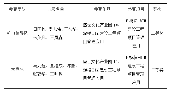经过来自全国各高校的几百位专家网络评审,我校选送的“盛世文化产业园1、2#楼BIM建设工程项目管理应用”“盛世文化产业园5#楼BIM建设工程项目管理应用”两个作品均获二等奖。