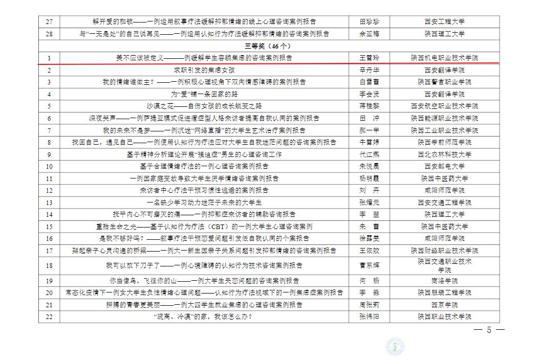 第八届陕西高校心理健康教育优秀咨询案例推选中,我校教师 王雪玲、屈娜 分获 三等奖。