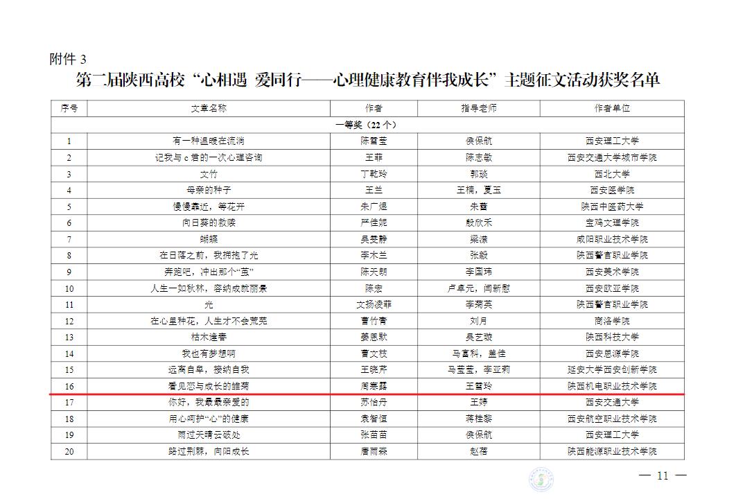 第二届陕西高校“心相遇爱同行——心理健康教育伴我成长”主题征文活动中我校学生 周寒露 获得 一等奖(指导教师王雪玲)、杨佳伟 获得 三等奖(指导教师张玉琼)。