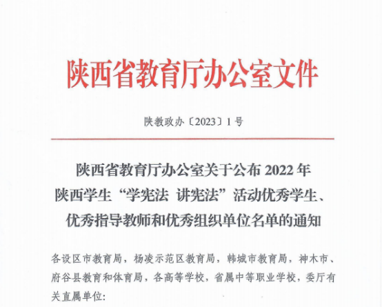 近日,陕西省教育厅办公室发布《关于公布2022年陕西学生“学宪法 讲宪法”活动优秀学生、优秀指导教师和优秀组织单位名单的通知》(陕教政办〔2023〕1号),我校荣获优秀组织单位。