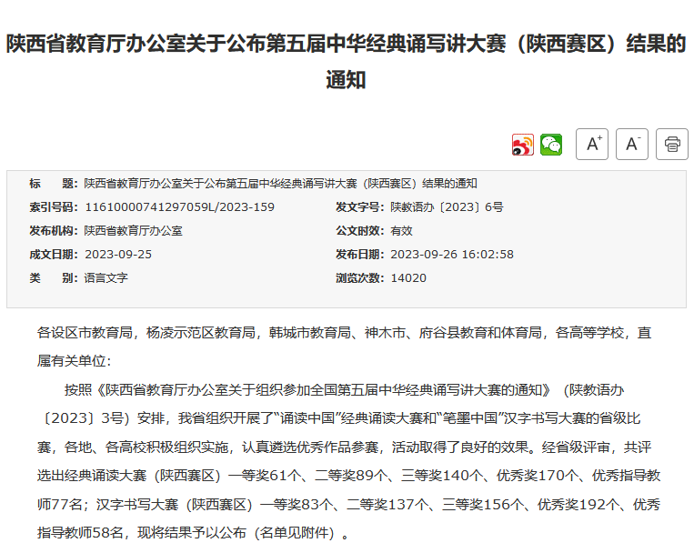 买球赛的app官网师生在陕西省第五届中华经典诵写讲大赛喜获佳绩