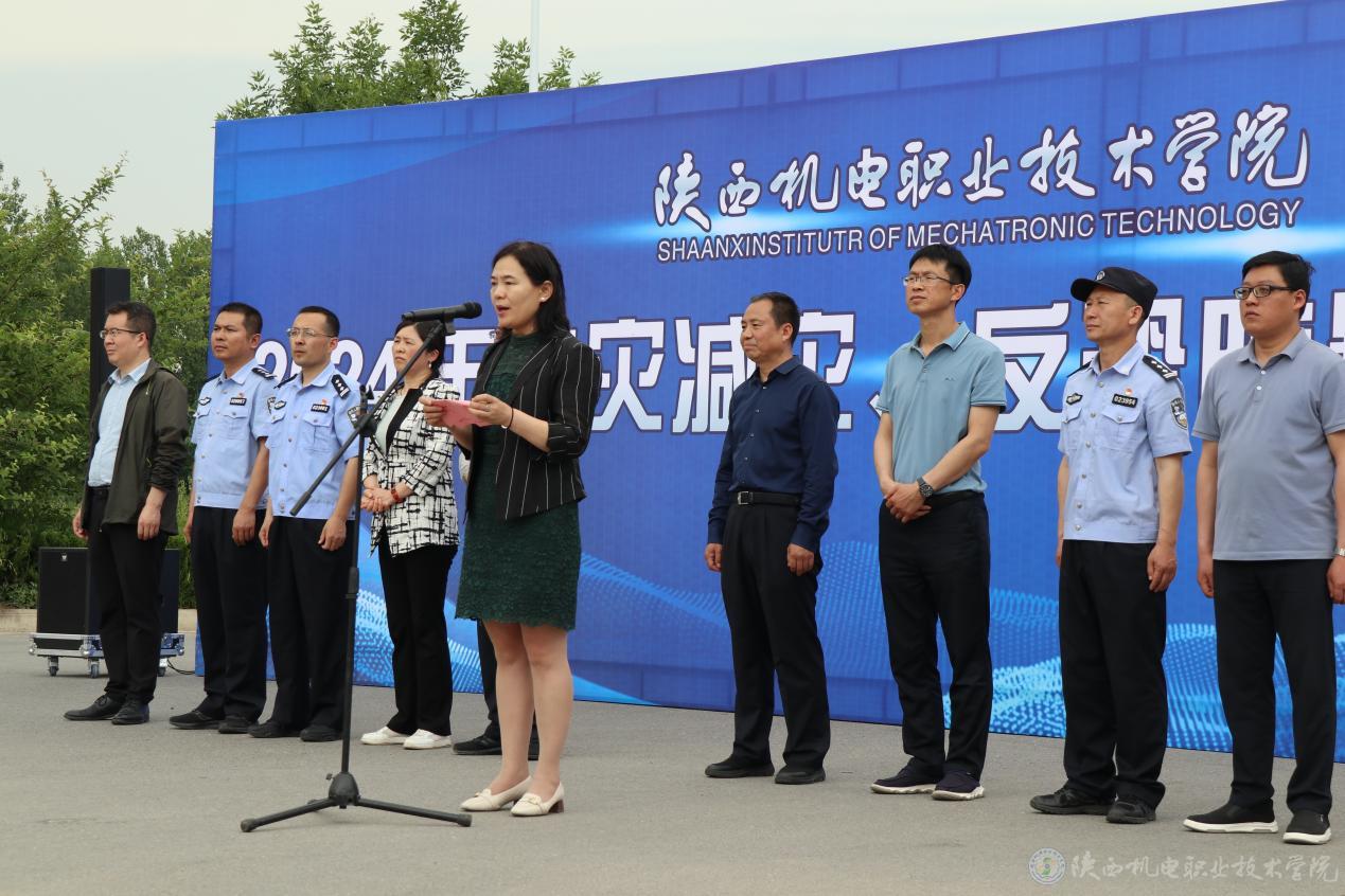 为了进一步做好我校防灾减灾反恐防暴宣传教育活动,加强全校师生的应急避险与自救互救能力,贯彻落实省委教育工委《关于做好 2024年全省教育系统防灾减灾救灾工作的通知》(陕教工稳办〔2024〕25 号)精神,5月16日下午,我校在蟠龙校区开展了以“人人讲安全 个个会应急”为主题的2024年防灾减灾、反恐防暴应急演练活动,实战演练得到了蟠龙派出所的大力支持。学校特邀宝鸡市公安局反恐支队支队长邓文涛,金台分局党委委员王志卫,金台分局经文保大队大队长党斌及相关领导莅临现场进行指导,学校党委副书记、纪委书记陈红梅,党委委员、宣传部部长李明,二级学院、相关部门负责人及师生共计1600余人参加活动。活动由保卫处综合管理科科长张小辉主持。
