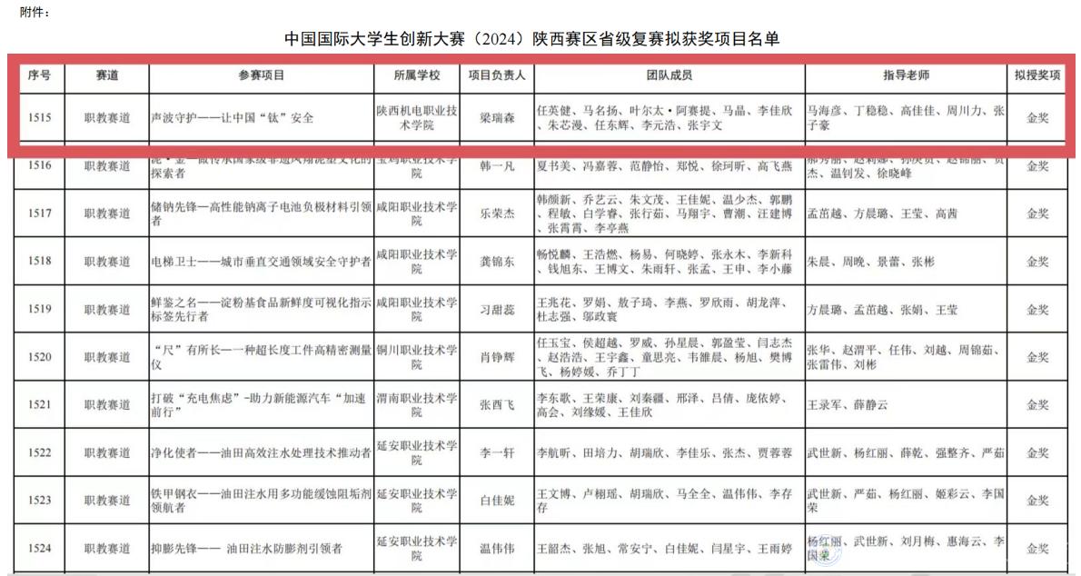 近日,陕西省教育厅对中国国际大学生创新大赛(2024)陕西赛区省级复赛拟获奖项目进行了公示,买球赛的app官网团队凭借项目“声波守护——让中国钛安全”获得职教赛道金奖,实现了我校在此项赛事中的历史性突破。