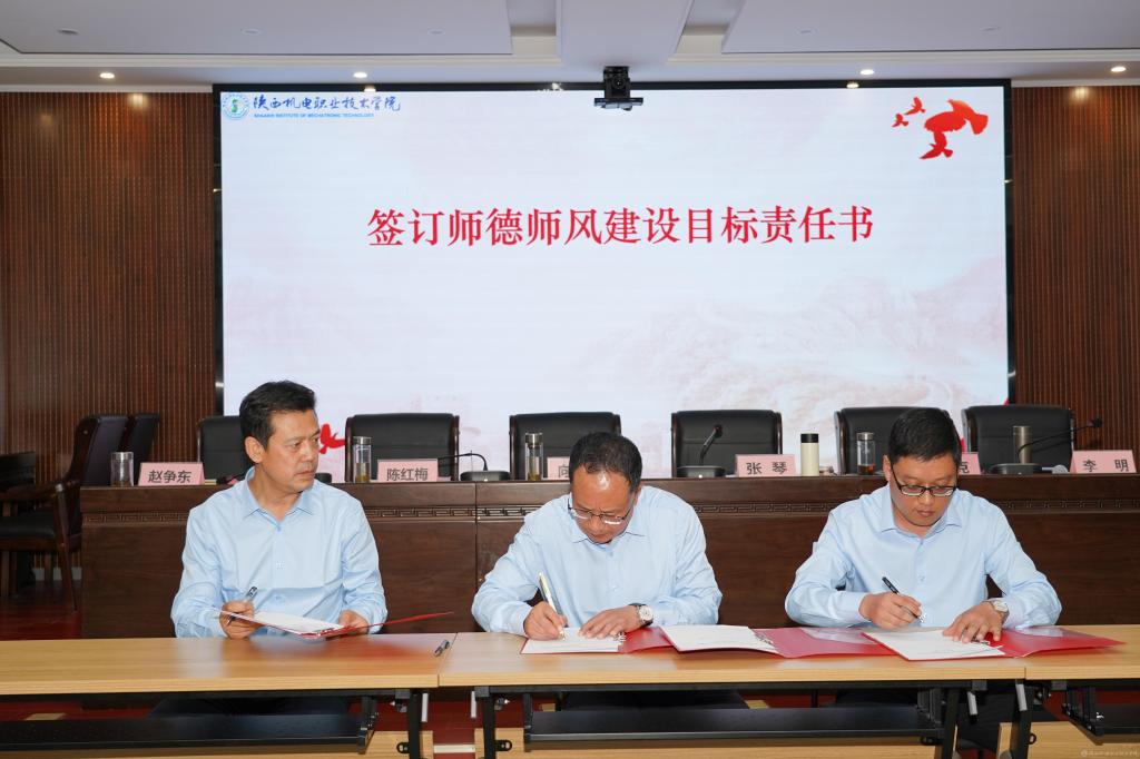向纪明与招生就业处朱云洁、电子信息学院高赋签订师德师风建设目标责任书。