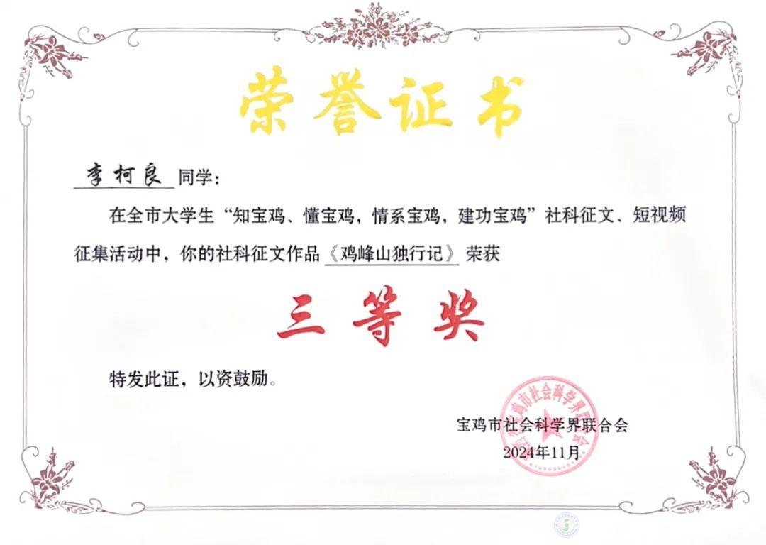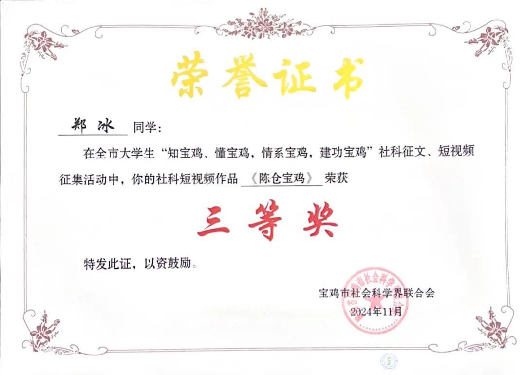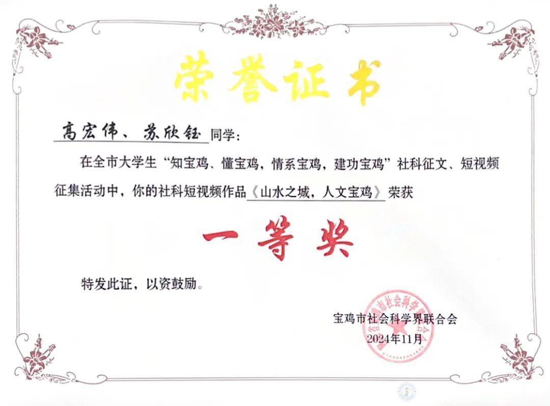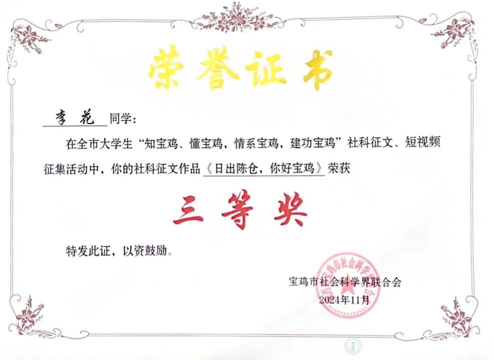 根据《关于在全市在校大学生中开展“知宝鸡、懂宝鸡,情系宝鸡,建功宝鸡”社科征文、短视频征集活动的通知》,由宝鸡市社科联联合在宝高校共同举办的“知宝鸡、懂宝鸡,情系宝鸡,建功宝鸡”社科征文、短视频征集活动评选结果出炉,我校学子在征集活动中荣获一等奖1项、三等奖3项,刷新最好成绩,实现历史性突破。