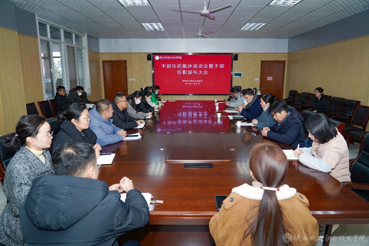 12月24日上午,学校党委在蟠龙校区图书馆二楼会议室召开新任职干部任前集体谈话会暨干部任职宣布大会。党委委员、院长助理、组织部部长赵争东,纪委副书记、纪律检查室主任王芙蓉,新任职干部及所在二级学院、部门科级以上干部参加会议,会议由党委组织部综合科科长张玉琼主持。