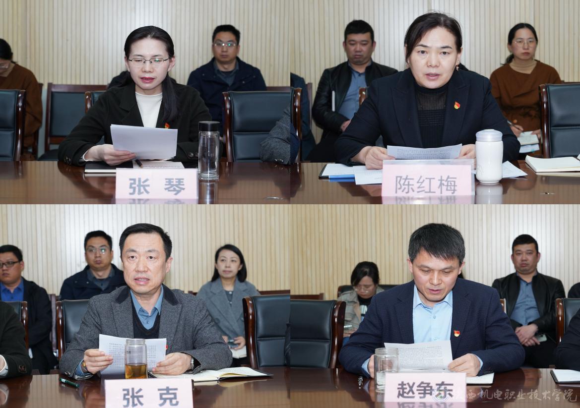 党委副书记张琴,党委副书记、纪委书记陈红梅,党委委员、副院长张克,党委委员、院长助理赵争东分别传达学习了习近平总书记在二十届中央纪委四次全会上发表的重要讲话精神和党的二十届中央纪委四次全会精神,及教育系统全面从严治党工作视频会议、十四届省纪委四次全会、全省教育系统全面从严治党工作会等会议精神。