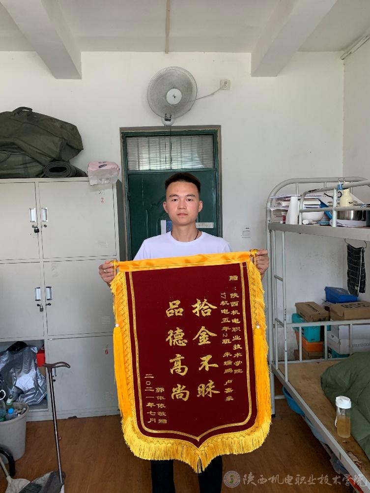 经了解,送锦旗的人叫郭依依,在6月中旬的一个傍晚,郭师傅在长岭学校公路附近把一个装有一千多元现金、几张银行卡还有身份证的崭新黑色皮包遗失了,当警察打电话让他认领失物的时候,他才知道是机电职院17机电五年2班的朱瑞鹏和卢佳豪在路边捡到并交给了警察,让警察帮忙寻找失主。