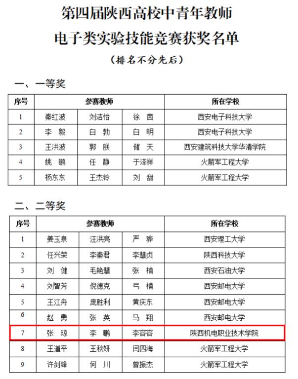 陕西省第四届中青年教师电子类实验技能大赛竞赛结果揭晓。我校电子与信息学院两支参赛队参加了此次竞赛,其中张琼、李鹏、李容容组成的参赛队喜获二等奖,同时,我校还荣获优秀组织单位奖,姜有奇老师被评为优秀组织个人。