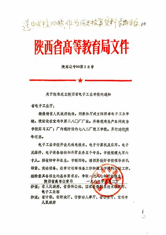 陕西省高教局发《关于批准成立陕西省电子工业学校的通知》(陕高教专[1986]第38号文)